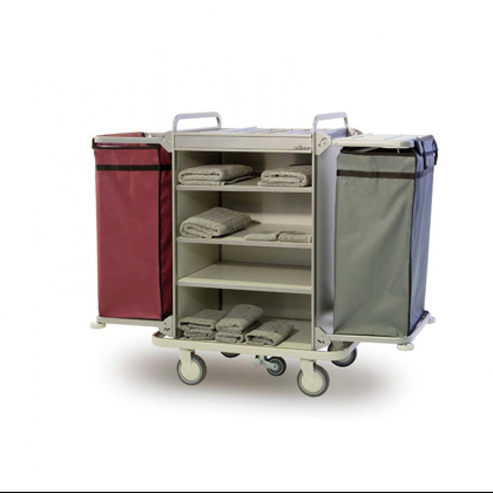 » E. static painted sheet iron structure » Two linen bag holders » Easy removable bag » 4 swivel caster, 2 with brakes